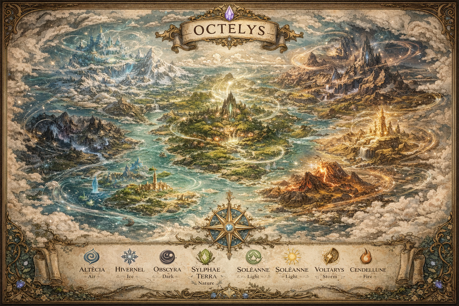 Carte d'Octelys, réalisée par IA pour donner vie à ma vision.